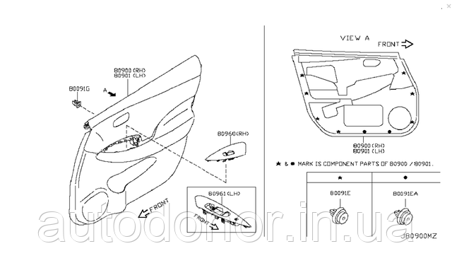 АСОРТИМЕНТ : Двері алюмінієва гола електромобіля,обшивка дверей (карта двері), ущільнювач дверного отвору, датчик закриття двері, ключ двері Smart на 3 і 4 кнопки, накладка ручки дверей хромовані, механізм ручки дверей зовнішній, ручка салону внутрішня, замок електричний двері, личинка замка дверей, скоба замка дверей, молдинг двері-скло, накладка двері бічна, накладка обрамлення скла, напрямні скла двері, обмежувач ходу двері, петля двері, механізм склопідіймача, моторчик склопідіймача, емблема двері ZeroEmission, Nissan